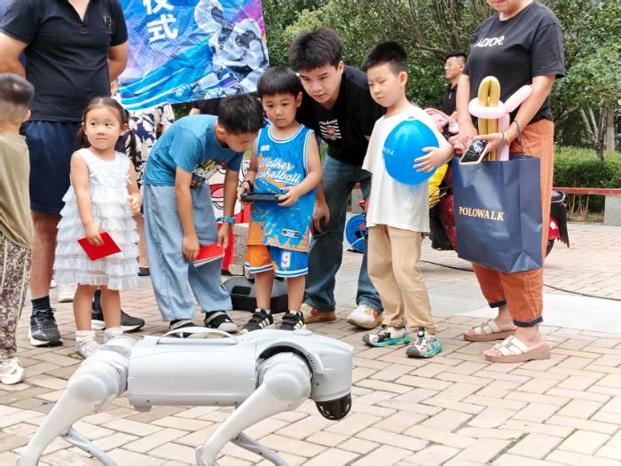 現場最受歡迎的當屬機器狗互動環節。實踐團成員先操控機器狗完成前進、轉彎、跳躍等一系列“高難度動作”,引得孩子們發出陣陣驚呼;隨后蹲下身手把手教學,讓孩子握住操控器,在“下達指令—觀察反應”的過程中感受AI技術的響應邏輯。