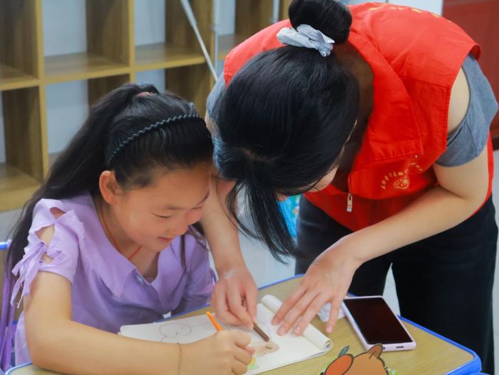 繪畫課上,孩子們都專注于創作,運用簡單的線條勾勒出一個又一個卡通人物,充滿了稚氣與童真。并且隊員們鼓勵孩子們不拘泥于主題,大膽發揮自己的創造力,教室瞬間成了綻放想象力的樂園;體育課上,盡管夏日驕陽似火,卻擋不住孩子們躍動的熱情。隊員們與孩子們一同參與,時而充當“游戲指揮官”,時而化身“活力玩伴”。奔跑、躲閃、反應……孩子們在游戲中不僅鍛煉了肢體協調性,更在團隊互動中學會了配合與應變,操場上的歡呼聲此起彼伏。