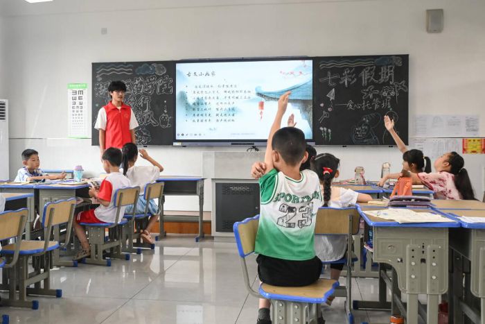 課堂上,身著紅色志愿服的實踐隊隊員們,先以“祖國旗幟在我心”開啟紅色文化課程。從國旗的歷史意義,到黨旗、團旗、隊旗的象征內涵,通過PPT展示、知識問答互動,引導孩子們了解旗幟背后的紅色故事,激發愛國愛黨情懷,稚嫩的小手紛紛舉起,搶答聲此起彼伏 。