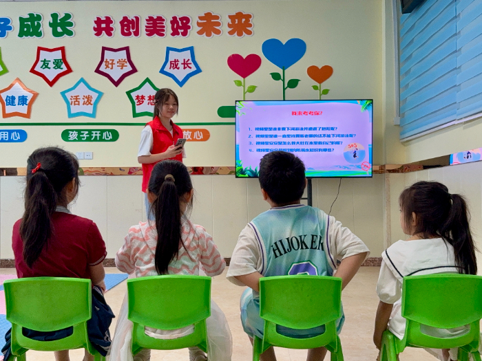 上午活動伊始,實踐隊成員以豐富的知識儲備和飽滿的熱情,為孩子們開展了一節“防溺水”課程,以簡潔生動的語言,文字與視頻相結合,知識問答等教授孩子們防溺水知識,讓孩子們深刻的了解到了遠離危險水域,不擅自下河游泳,以及應急求救,正確呼救等防溺水措施。