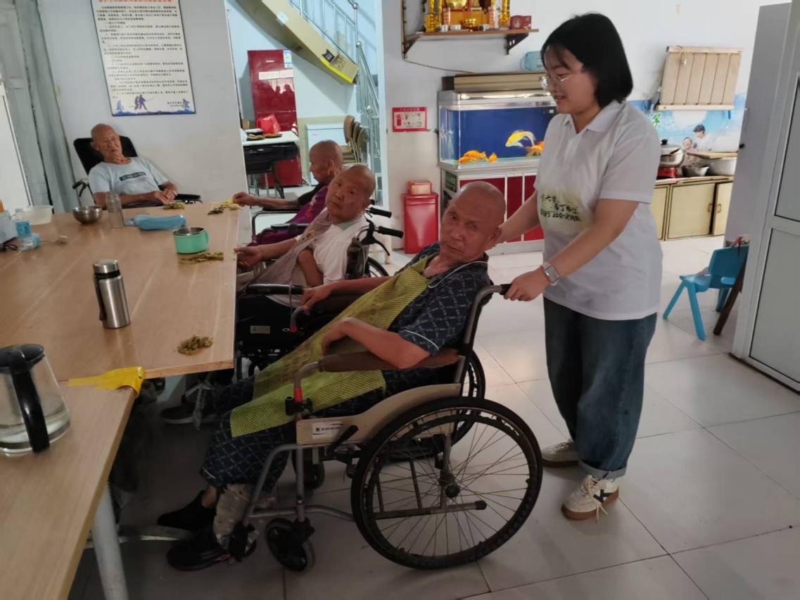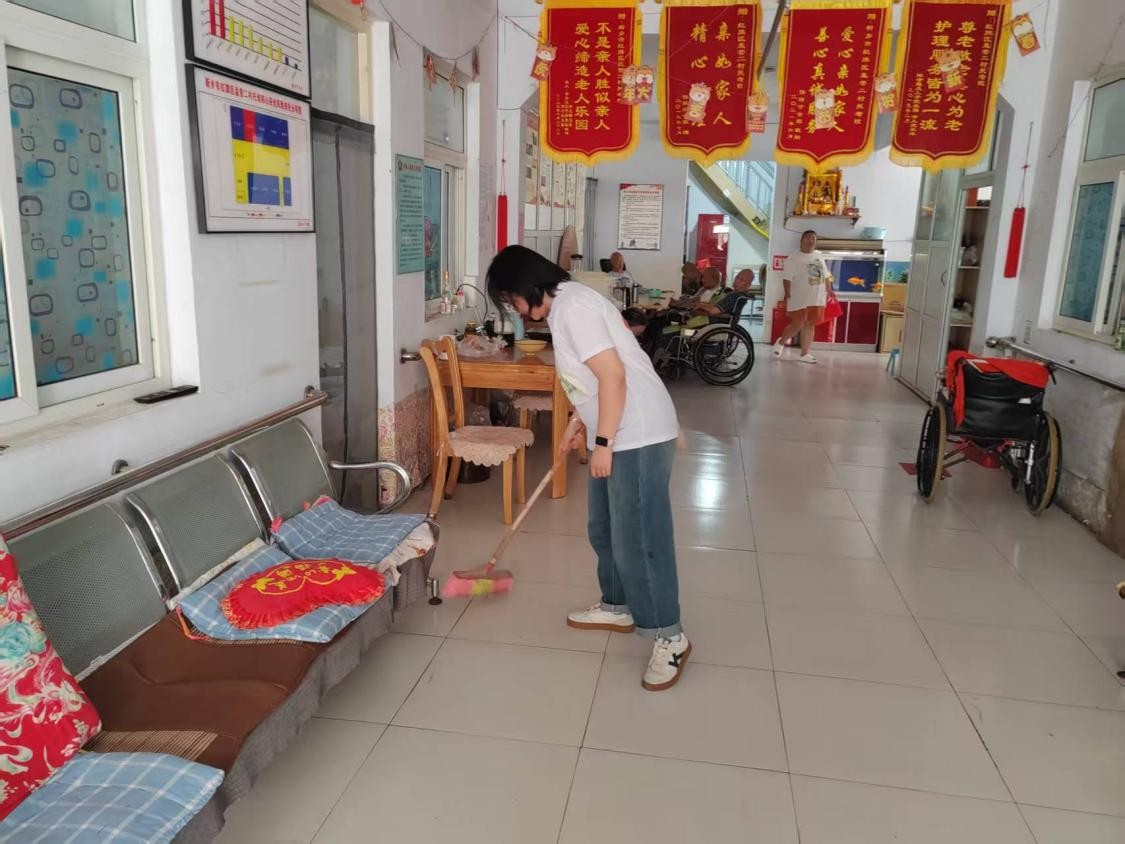 與老人們交流結(jié)束后恰逢養(yǎng)老院自由活動時(shí)間,團(tuán)隊(duì)成員看到那些坐著輪椅行動不便的老人在餐桌旁不能移動,便主動上前詢問了老人的需求,推動輪椅帶老人回了房間,還細(xì)心地為老人檢查了輪椅安全帶。在隨后的打掃衛(wèi)生環(huán)節(jié),團(tuán)隊(duì)隊(duì)員仔細(xì)清掃了地面,為老人們營造了一個(gè)更加干凈整潔的環(huán)境,還特地細(xì)致清掃了老人們的日常互動區(qū)域,防止老人們在活動時(shí)跌倒,用自己的實(shí)際行動踐行了孝道。