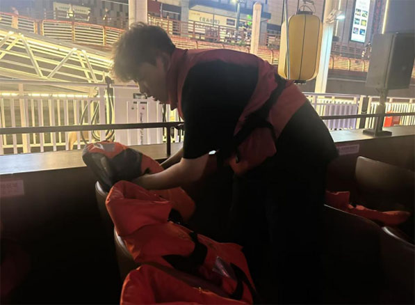 實踐團成員在船上恪盡職守,提前將救生衣整齊放置在游客觸手可及之處。登船時,并主動引導游客正確穿戴。航行期間,實踐團成員來回巡視,確保安全無虞。細致服務讓游客盡情沉醉于瑯琊夜景。