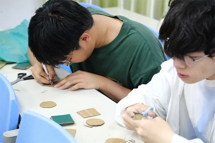 在以“青春必行,以行動表志”的主題活動中,同學們收集廢棄的紙殼,進行精心再造,將廢物剪裁、塑型、拼接、粘貼。沒有專業的工具,就用雙手代替:用雙手折出的紙花瓣如青春之蝶縈繞在非遺之原的上空。沒有現成的教程,就靠協作摸索。原本臟舊的紙殼成為了一顆顆精美的繡球,原本空白的折紙成為了一盞盞玲瓏的花草燈。當“廢物再利用”遇上“非遺傳承”,碰撞出了非遺文化在新時代絢爛的火花。