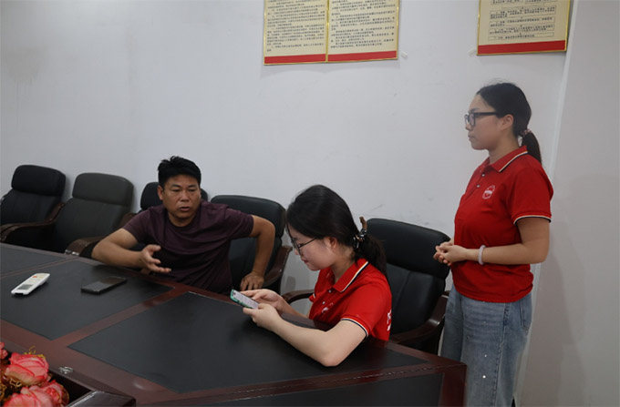 圖為團隊成員采訪隘門村村書記龔宗亮 姜欣雨 攝