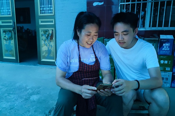 圖為村民詢問實踐隊員該如何下載國家反詐中心APP,實踐隊員正在幫村民下載。中國青年網通訊員 胡程 攝