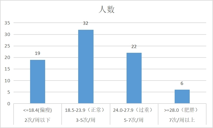 上圖可知,過多飲用含糖飲料的人,BIM指數(shù)大于24.0。因此,飲用含糖飲料的次數(shù)與肥胖人群的數(shù)量存在一定的相關(guān)性。若不能及時(shí)消耗攝入過量的糖分,可能會(huì)促進(jìn)脂肪的儲(chǔ)存,進(jìn)而引發(fā)肥胖的健康問題。