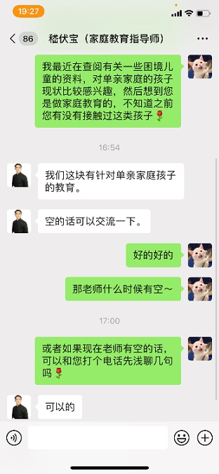 7月22日,小青檸志愿者團隊在完成信息收集整理工作后,開始著手聯(lián)系福利院、社區(qū)等相關單位。由于疫情的影響,最終小青檸志愿者團隊聯(lián)系到了從事家庭教育事業(yè)5年的嵇伏寶老師,并約定于8月9日以電話的形式進行訪談。