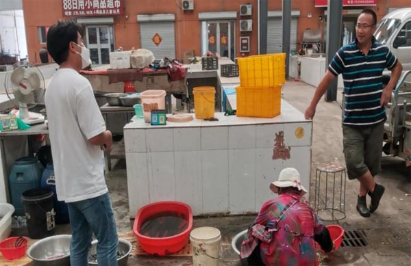 接著,實踐團隊成員來到了養殖場附近的水產市場。市場十分喧鬧,整齊有序的攤位映入眼簾,各種各樣的魚蝦應有盡有。一位賣魚的王阿姨告訴實踐團隊:“我們一家四口人,都是靠我們兩口子賣魚過日子。我們魚新鮮買的人也多,生活質量也早已達到小康水平了。”