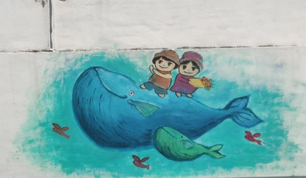 在秀岸村,丹青繪夢志愿服務(wù)團進行了4幅墻繪的創(chuàng)作。在秀岸村村委會的大力支持下,實踐團成員們明確分工,配合默契,結(jié)合“童趣”“插畫”“文明”等主題,用巧手點綴白墻灰瓦,用山水畫、人物畫等多種繪畫方式將創(chuàng)新、協(xié)調(diào)、綠色、發(fā)展的理念融入鄉(xiāng)村振興的美好畫卷。作品圍繞“童趣”主題,整幅畫給人一種奇幻的新奇感,放眼望去,湛藍的海洋,夢幻的鯨魚,微笑的孩童,跳躍的飛魚,一個充滿幻想,神奇的夢幻海洋躍然墻面。希望人們用天真無邪的眼睛去發(fā)現(xiàn)生活中的美好,用一顆熾熱的童心去感受生命中的溫暖,用一臉童真的笑容去感染身邊的人,用心生活快樂無限。