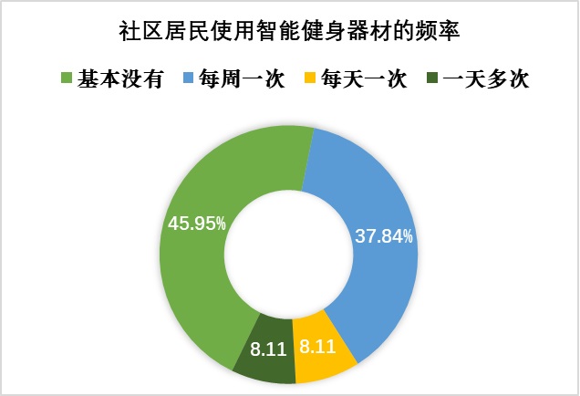 圖5.3.1問卷調(diào)查結(jié)果——是否有可供使用的智慧化場地 為進一步了解居民身邊的智慧化健身場地的設(shè)施情況以及使用情況,我們進行了深入調(diào)查。附近有智慧化健身場所的居民在近一個月內(nèi),使用過智能健身器材的人數(shù)并不多,僅為35.58%,而使用過的這些人中,能夠堅持每天使用的更是少之又少,偶爾才使用一次的居民占了絕大多數(shù);蚴鞘茏陨碓虻募s束,或是受鍛煉場所的環(huán)境影響,總而言之,即使在社區(qū)健身逐漸智慧化的情況下,居民的健身熱情仍未見顯著提升,由此看來社區(qū)的設(shè)施配備情況僅是一方面,而動員社區(qū)居民增強健身意識的工作亟待提上日程。調(diào)查結(jié)果如圖5.3.2和圖5.3.3。