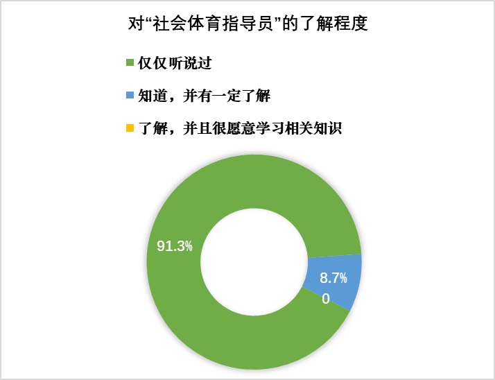 圖5.1.2問卷調(diào)查結(jié)果——是否知道“社會體育指導(dǎo)員”這一職業(yè) 鑒于社會體育指導(dǎo)員在社區(qū)健身公共服務(wù)中起到的作用較為突出,我們又對其中知道“社會體育指導(dǎo)員”這一職業(yè)的21.74%的問卷調(diào)查參與者實施了更進一步的調(diào)查、訪談。經(jīng)了解,有91.30%的受訪者表示僅僅聽說過該職業(yè),8.7%的受訪者不僅知道,而且有一定的了解,但了解并且愿意學(xué)習(xí)相關(guān)知識的受訪者人數(shù)為0。調(diào)查結(jié)果如圖5.1.3。