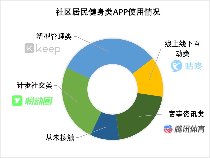 圖5.3.3問卷調(diào)查結(jié)果——社區(qū)居民使用智能健身器材頻率 5.4.全民健身大數(shù)據(jù)應(yīng)用情況運動健身類APP是指擁有可以幫助用戶記錄運動健身數(shù)據(jù)、指導(dǎo)運動項目學(xué)習(xí)、引領(lǐng)健康生活方式等功能的智能手機或穿戴設(shè)備第三方應(yīng)用程序。在大眾休閑體育和全民健身的背景下,人們的鍛煉方式有了極大的改變,而運動健身類APP是用戶進行鍛煉的最佳工具之一,很多鍛煉者利用各種運動健身類APP進行輔助和指導(dǎo)鍛煉,有效改變了傳統(tǒng)運動健身方式的枯燥性,使運動健身實現(xiàn)量化,更具有科學(xué)性和趣味性。