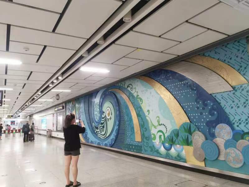 為深入調查研究西安地鐵文化,實踐團成員來到北客站,西安地鐵二號線的起始點展開實地調研。通過觀摩西安地鐵文化墻以及相關人員對地鐵文化墻的講述,實踐團成員了解到,西安地鐵二號線以文化墻為主,將西安傳統文化與現當代文化進行了結合,用壁畫的形式將古老的故事傳遞給乘坐地鐵的人們,傳承千年古都悠久的歷史文化。