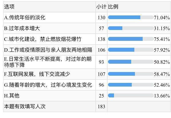 觀察以上圖表可發(fā)現(xiàn):人們認(rèn)為年味變淡的原因主要有:傳統(tǒng)習(xí)俗的淡化、過年成本增大、城市化建設(shè)和禁止燃放煙花爆竹、工作或疫情原因與親朋好友兩地相隔、日常生活水平不斷提高,對過年的期待感下降、互聯(lián)網(wǎng)發(fā)展,線下交流減少和隨著年齡的增大,過年心境發(fā)生變化。曾有社會學(xué)家說過,春節(jié)的發(fā)展便是以宗族和血緣為基礎(chǔ)的。而當(dāng)這些基礎(chǔ)被改變后,春節(jié)的本身也會發(fā)生改變,還可能與下列原因有關(guān):1.越長大,越對感情無感小時候,我們對春節(jié)有著極大的興趣,是因為那時候的我們還重視感情,對身邊的人有著極大的期望和善意。可是,當(dāng)人逐漸長大之后,這樣的感情也就變了。2.快節(jié)奏社會,人情變得淡漠如今的社會,就是一個“快節(jié)奏”的社會。說起快節(jié)奏的社會,其實它有一個明顯的優(yōu)點(diǎn)和一個明顯的缺點(diǎn)。優(yōu)點(diǎn),就是快節(jié)奏的社會能帶給人一定的發(fā)展機(jī)遇,讓人的物質(zhì)得到極大的滿足。而缺點(diǎn)就是,就是快節(jié)奏的社會給人帶來無盡的虛偽和欺騙,讓人情關(guān)系變得冷漠下來。要知道,我們和親朋好友在春節(jié)期間的相互往來,就是基于人情關(guān)系而言的。而當(dāng)人情關(guān)系遭受到了破壞,那么我們內(nèi)心就會出現(xiàn)一根刺,就會對節(jié)日無感。如此,年味就會越來越淡。3.生活條件變好,對過年沒有期待在以往,人們要想穿到新衣服,或者說吃到豬肉或者其余的美食,就必須等到春節(jié)的到來。而如今呢?隨著物質(zhì)生活的極大豐富,現(xiàn)在的很多人,他們隨時都能買新衣,吃到美食。那么,我們對于過年的期待感就在逐漸地減少。4.科技發(fā)達(dá),能做到即時交流過年,在中國文化之中,就是象征了“團(tuán)圓”。留在家鄉(xiāng)的父母希望能見到孩子一面,而遠(yuǎn)在外地漂泊的游子,也想和家人相見團(tuán)聚。直到現(xiàn)在,這樣的感情和希望都是相同的。可唯一的不同就是,隨著科技的發(fā)展,現(xiàn)在我們隨時都能進(jìn)行視頻聊天,也能隨時隨地回家。科技發(fā)達(dá)了,帶給人的,既是便捷,更是感情寄托的逐漸減少。想想看,以往一年才能見一面,現(xiàn)在在手機(jī)上每天都能見面。那么,新年團(tuán)圓的氣氛就會受到影響,年味也將變得淡漠下來。5.網(wǎng)絡(luò)化發(fā)展,有趣的事情在增多有人曾評論道:“網(wǎng)絡(luò)化時代帶給人的,就是虛擬世界的逐漸生活化。”智能手機(jī)的普及,讓我們每個人都能成為網(wǎng)絡(luò)世界的一員。而網(wǎng)絡(luò)世界,它帶個人們的資訊和資源,那是比現(xiàn)實世界還要豐富的。在以往,人人過春節(jié)都是面對面,一同談天說地來度過的。可如今呢?大多人都把時間花費(fèi)在網(wǎng)絡(luò)空間中。尤其是網(wǎng)絡(luò)活動的愈發(fā)豐富,網(wǎng)絡(luò)“集福”活動的有趣化,讓人們都無視了現(xiàn)實中的年味,而更在乎手機(jī)中的活動了。如此,網(wǎng)絡(luò)化的發(fā)展,它帶給人的,就是許多有趣的事兒。而另一方面,它也削弱了現(xiàn)實的年味。