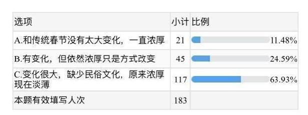觀察以上圖表可看出:大約百分之十一的人認(rèn)為和傳統(tǒng)春節(jié)沒有太大變化,一直濃厚;大約百分之二十四的人認(rèn)為有變化,春節(jié)氛圍依然濃厚只是方式有改變;占大多數(shù)的人認(rèn)為變化很大,缺少民俗文化,原來濃厚現(xiàn)在單薄,占比達(dá)到了百分之六十三。記得小時候,我們每個人最為期待的,應(yīng)該就是過年了。