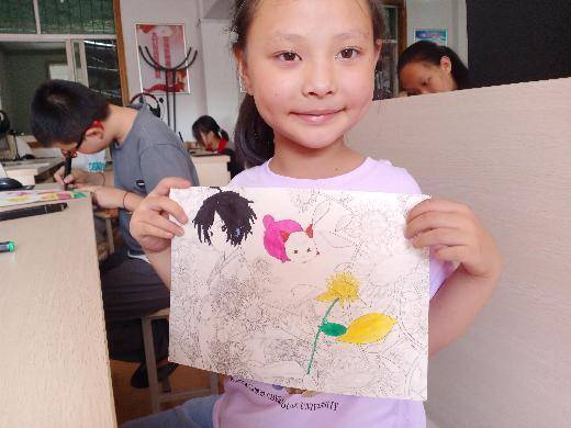 圖為小姑娘展示自己的填色卡,其他同學也在專心涂色。李振揚 攝