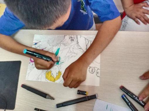圖為美術課結束時小朋友繼續填色訓練。李振揚 攝