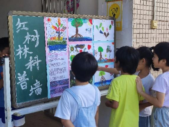 隨后,實踐隊員組織同學們有序地前往位于樓下的科普墻進行參觀,進一步學習更多關于紅樹林的背景知識。將知識貼上墻,是教育的一種創新,讓學生不僅限于課本課堂,有利于增加學生們的學習興趣,增強對知識的記憶。本次的科普墻上不僅有精心制作的關于紅樹林的課外知識,還有各種彩繪圖。同學們都圍成一圈,邊觀察邊討論自己的理解,可謂是其樂融融。