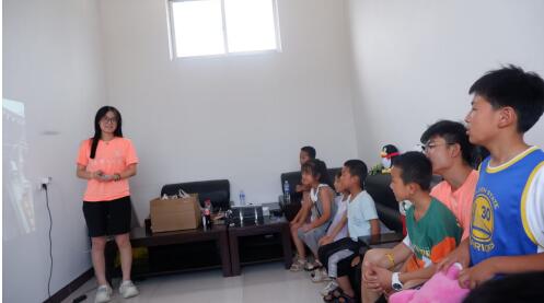 圖為實踐團成員向洼子村學生介紹山東淄博