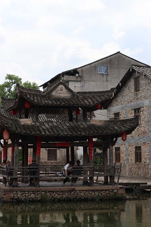 移步換景,酷暑難耐,我們來(lái)到了芙蓉亭避避暑。該亭就建在池中,是一座兩層樓閣式歇山頂?shù)姆酵ぃぷ语w檐翹角,空透玲瓏,像是一朵盛開的芙蓉花。亭內(nèi)設(shè)有美人靠,人們通過(guò)南北二條長(zhǎng)長(zhǎng)的石板橋進(jìn)入亭內(nèi),這里成了老人們聚集閑聊的好地方,尤其是夏、秋天的晚上,村民們?cè)缭绲貋?lái)到這里納涼、憩歇、聊天。