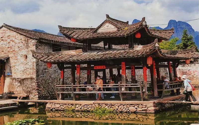 首先,我們小組由古村口東門進入,村口的設計是浙南一帶常有的木質結構搭建的一座三開間、歇山式兩層樓閣建筑,配飾著大紅燈籠和喜慶的紅對聯;進門右轉穿過小門,踏過門檻位于如意街北側,可見一處古院,標有“陳氏大宗”幾字,據文獻書籍了解,因其格局嚴謹,形制完備,是芙蓉古村建筑中的精華之一。同時院內設有多處講解陳氏先人陳虞之于宋末元初時抗擊元軍,后英勇殉國的壯烈往事,為時代譜寫了一曲可歌可泣的壯烈樂篇,在此處還設有紀念芙蓉古村自古時的陳氏名人,自古以來此地便誕生了多位進士,走出了近300位官員,最高做到了南宋左宰相,其中最著名的18位官員也被村民尊稱為“十八金帶”。可見,自古以來,芙蓉村村民便注重教育讀書以及對人品格性情的培養。接著,我們穿過如意街,其所謂全村最熱鬧的地方,也是村名閑暇是聚集閑逛的好地方,如意街街心地面鋪有不同于村內其他街道的卵石,利用了青磚鋪地,以突顯村落中心。來到了芙蓉亭,此亭建于池中偏東的地方,是一座兩層高的樓閣式歇山頂樣的方亭,亭子飛檐翹角,充滿活力玲瓏之感,正映照了芙蓉亭的名號,像一朵綻放的芙蓉花。亭子供村內老人聊天乘涼,以溫州方言講便是“過阿達以和地否”。