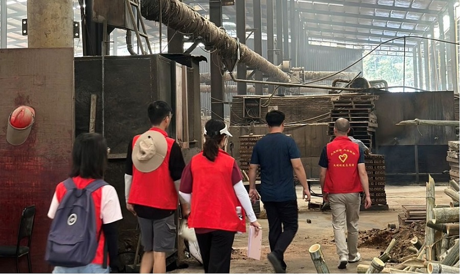 圖為李明武書記帶領實踐團成員參觀富溪源竹木制品廠