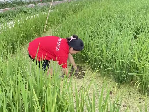 【稻花魚基地】實踐團成員深入田間,體驗稻花香“鯉”說豐年的田園風光,輕輕撥動稻穗,清除稻田中的雜草,檢查稻苗長勢與魚苗生長情況,并放入新一批優質魚苗。
