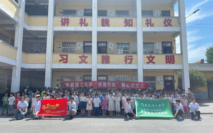 圖為安徽理工大學志愿服務隊伍與廟岔鎮第一小學在校全體師生合影留念