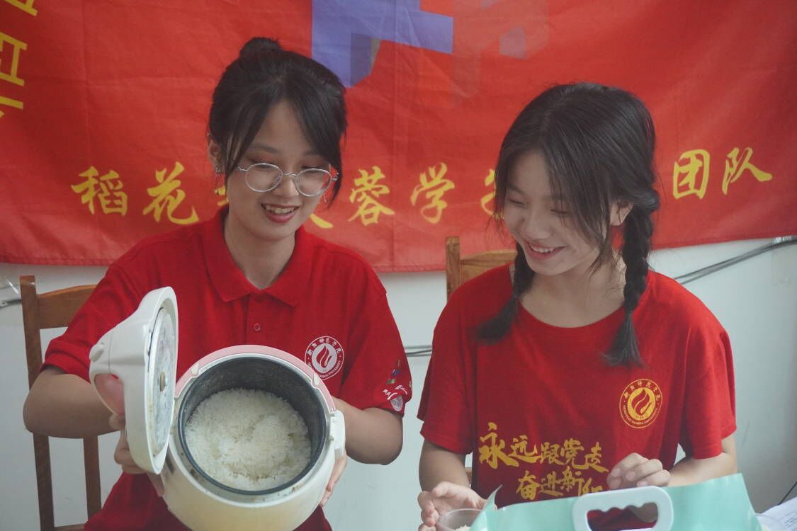 “白如玉,長如針”是對“玉針香”魚稻米最恰當(dāng)?shù)男稳荩瑢嵺`團成員通過“現(xiàn)場烹飪”向觀眾展示稻米,煮熟的米飯粒粒飽滿、顆顆分明、香氣四溢。軟糯香甜的口感讓成員們不禁感慨:“再來一勺辣醬我可以干完一整碗米飯!”