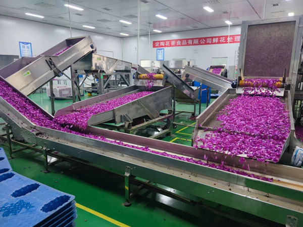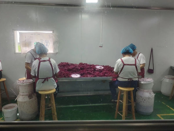 在參觀過程中,實踐團成員觀察到許多婦女在對玫瑰花進行挑揀,邵長征介紹,該公司有玫瑰花合作種植基地5000余畝,每年以8000元每畝的價格收購農戶種植的玫瑰花,增加了周邊農戶的收入。該公司年產玫瑰糖2000多噸,吸納農民工、農村轉移勞動力,帶動就業200余人以上。實踐團負責人肖涵總結:玫瑰產業的發展為當地鄉村振興帶來了很大幫助,一方水土育一方企業,也能養一方群眾。