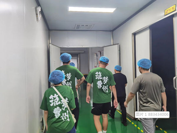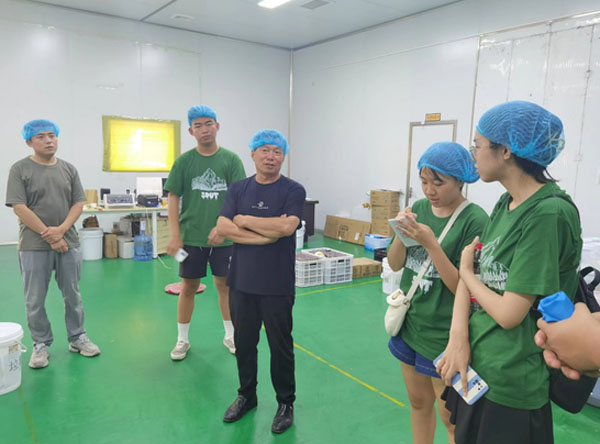 實踐團成員與當地政府進行簡單對接后,在定陶區團委副書記周備和辦公室主任孔銘的帶領下前往定陶花香食品有限公司。公司負責人邵長征熱情接待了實踐團成員,待實踐團戴好工作帽后,帶領實踐團在生產車間內進行參觀。