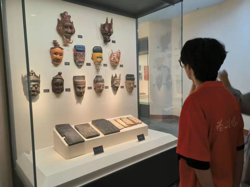 圖為“筑夢”社會實踐團隊聽取講解員講解仡佬族儺戲文化。