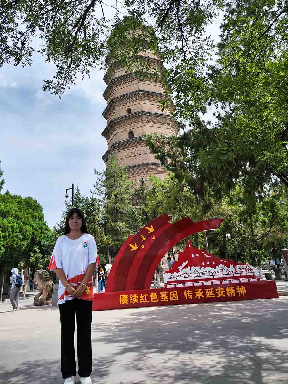 延安時期,寶塔山下的延安古城精華薈萃,戰歌嘹亮,成為中國革命的出發點和落腳點。登上寶塔山,駐足瞻仰,用心聆聽,重溫了老一輩無產階級革命家在延安生產、生活、戰斗的場景,感悟革命先輩在艱難困苦中、浴血奮斗之下所展現的延安精神。作為本期新發展的黨員,在寶塔山的見證下俞文琳老師為我佩戴黨徽,并莊嚴宣誓:“我志愿加入中國共產黨……”。在這神圣的時刻,我感受到了身上的擔子更重了。在今后的學習生活中,我將大力發揚延安精神,堅定理想信念,牢記使命擔當,貢獻青春力量。