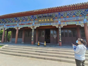 我們首先去探訪的是范公祠,據(jù)資料說,門前的大槐樹是北宋時(shí)期所植,但到現(xiàn)在依然枝繁葉茂。門口兩邊兩座石獅子,似有保護(hù)鎮(zhèn)守之意。大樹掩映下大門掛著“范公祠”三字的匾額,據(jù)資料顯示,是歐陽中石親筆著作,大門氣宇軒昂,多以石壘積而成,青磚黛瓦,匾額上方是藍(lán)黃色龍騰圖交相匯聚,與其上方綠色圖案相呼應(yīng),頗有古代建筑大門的意味。祠堂的主體采用