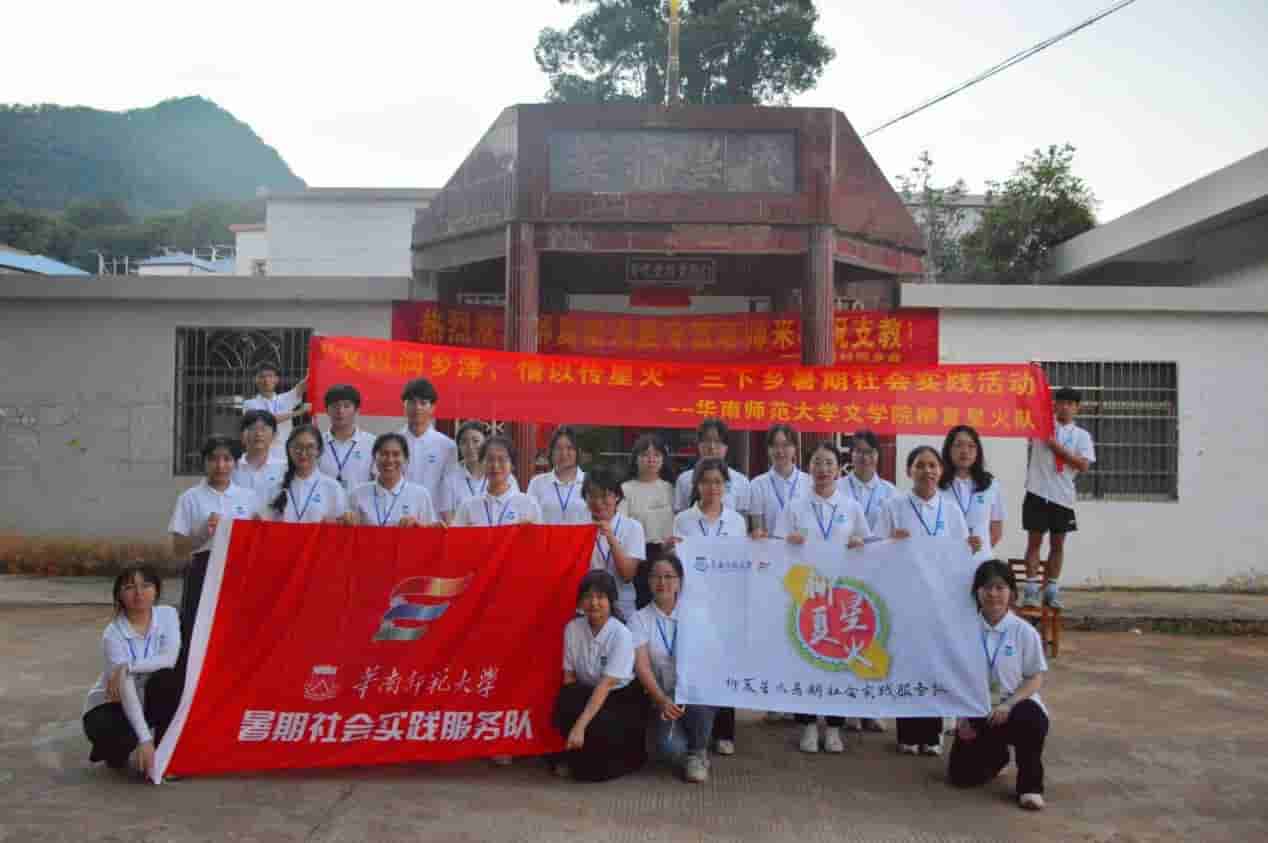 華南師范大學柳夏星火暑期社會實踐服務隊(以下簡稱為柳夏星火隊)由25名來自華南師范大學的學生組成,隊伍充分吸納了文學院、音樂院、旅游管理學院、體育科學學院、經濟與管理學院等多個院系的優秀同學,其中師范生比例達85%。本次活動面向梅州市大埔縣茶陽鎮華祝村小學,開展為期10天的“三下鄉”暑期社會實踐活動,隊內設文教、文體、宣傳、調研、生活五個組別。柳夏星火隊緊扣華南師范大學文學院“送經典到基層·星火鄉傳”的大主題,以“文以潤鄉澤,情以傳星火”為團隊主題,力圖綜合發揮多學科、多專業的團隊優勢,助力學生在“德智體美勞”上全面發展、增進對梅州當地歷史的了解、培養對梅州優秀傳統文化的興趣,以期學生們厚植家鄉情懷、牢記愛國主義。