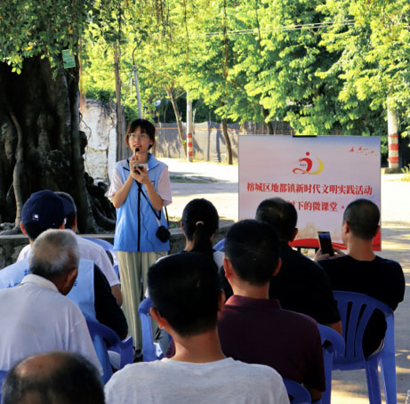 圖為實踐團在地都鎮大榕樹下開展古村落宣講會