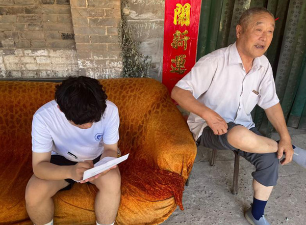 圖為團(tuán)隊(duì)成員柴岷坤與當(dāng)?shù)乩夏昊顒?dòng)中心老人進(jìn)行溝通并記錄。通訊員 孫振威 攝