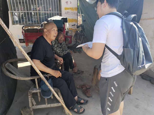 圖為團(tuán)隊(duì)成員劉金陽向當(dāng)?shù)乩先肆私夤苍O(shè)施建設(shè)問題。通訊員 柴岷坤 攝