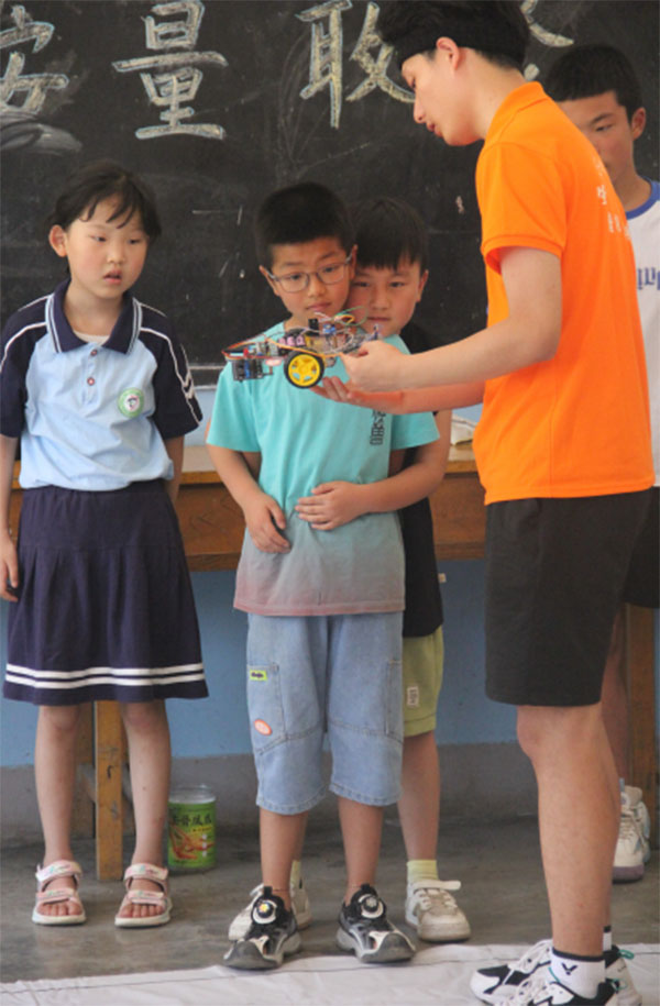 為了啟發學生們的創新思維和科學探索能力,實踐團隊先后在工業園區小學和下雷村小學開展了科普宣傳活動。實踐團隊通過科普講座的形式,向小學生們宣講了人工智能、機器人技術和虛擬現實等領域的知識。實踐團隊還為同學們帶來了循跡車、燈塔等科技作品,并現場進行了講解與演示。循跡車是一種利用光電傳感器和程序控制進行自動導航的智能小車。看著在黑色跑道自動導航循跡,快速靈活穿行的循跡車,現場同學都驚嘆于自動導航技術的奇妙;看著燈光交錯閃爍的燈塔,色彩斑斕、栩栩如生的發光蝴蝶,圍觀的的同學們都十分激動。同學們充滿熱情地聚集在一起,氣氛變得異常熱鬧,笑聲、歡呼聲、掌聲此起彼伏,整個場景仿佛被濃厚的熱情與活力包圍著。同學們圍繞在科技作品的旁邊,躍躍欲試,實踐團隊員手把手教同學們,讓他們親身體驗到了科技產品的神奇與魅力。