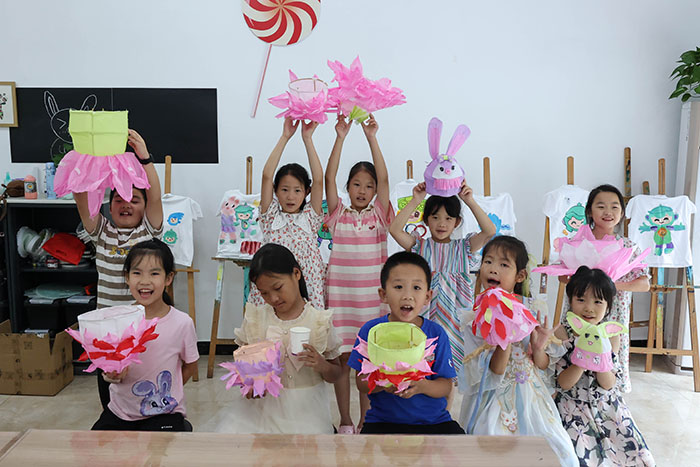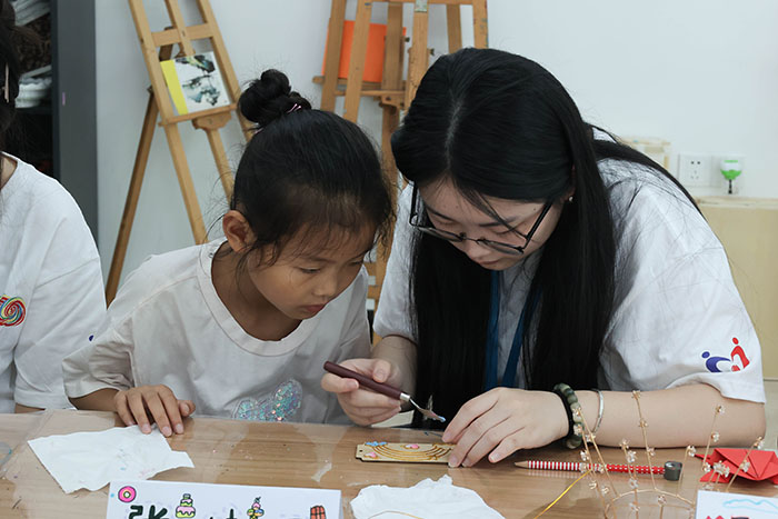 傳統(tǒng)文化,傳心承行“承傳統(tǒng)文化行美育之風(fēng)”,實踐初期,服務(wù)團以宣揚傳統(tǒng)文化為主題,學(xué)習(xí)與實踐相結(jié)合的方式將優(yōu)秀傳統(tǒng)文化融于課程。授課過程中,實踐團通過知識問答、趣味游戲等方式讓孩子們迅速融入了課堂。水墨畫課上,孩子們用不同的墨色繪出了他們的想象,而水墨落筆成形也教會了他們執(zhí)筆于心的沉穩(wěn);琺瑯掐絲課上,孩子們雖然感嘆著掐絲很難,手上卻不停地用銅絲一圈圈圍出美麗的形狀,這也讓我們看到了在美育教育下孩子們的細心與耐心得到了鍛煉;秦淮花燈課上,服務(wù)團成員攜手孩子一步步編織出花燈框架、粘上花瓣,點亮花燈。熠熠生輝的花燈捧在孩子們的手中,照亮著他們純真快樂的笑臉,點亮著他們欣欣燃起的夢想。