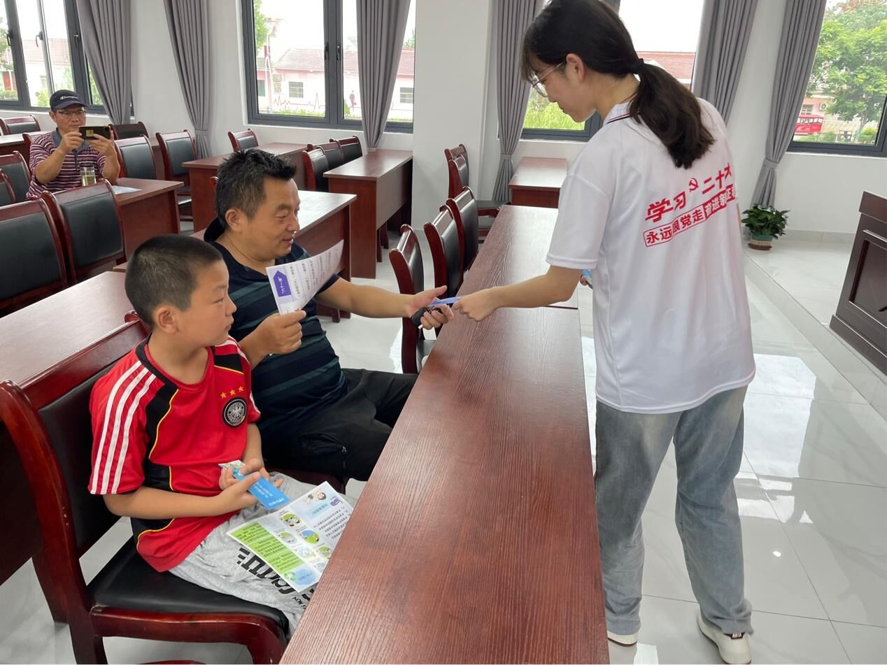 圖為調研團隊成員為前來聽宣傳講座的村民們發放宣傳海報。多彩大學生網通訊員 丁曉陽 攝