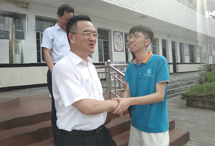 7月11日是活動開展的第三天,同時也是一個十分特殊的日子,這天下午16時,湖北醫(yī)藥學院黨委常委、紀委書記徐榮等一眾領導前往蒿口小學考察鄉(xiāng)村振興落實情況及對隊員們表示慰問。徐書記同實踐隊隊長郭旭進行了詳細的交流,就實踐隊的課程設計、日程安排、隊員分工等情況做了詳細詢問,囑托志愿者們一定要重視安全,注意身體。徐書記還詢問了隊員們在生活和支教工作中有何困難,表示學校是大家的堅實后盾。夏日炎炎,但領導老師的關心給予了隊員們莫大的鼓勵。領導們的慰問,當?shù)乩蠋焸兊闹С郑⒆觽兲煺娴男θ菔顷爢T們前行的動力,隊員們紛紛表示也會竭盡全力將支教工作做好。