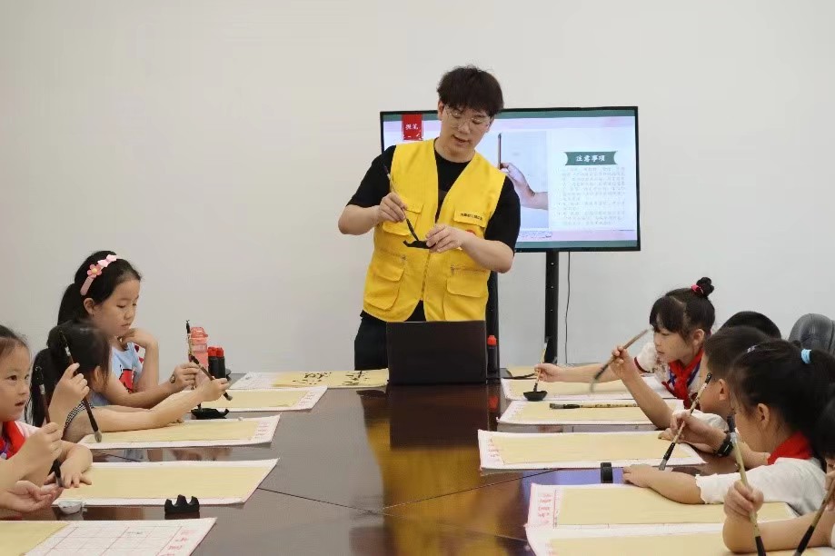 為了給小朋友們帶來精彩的書法課堂,護衛(wèi)隊的志愿者在課前就悉心準備,用毛筆寫了每個小朋友的繁體姓名牌并掛在教室里,準備給小朋友們一個驚喜。圖為童心護衛(wèi)隊志愿者教導小朋友書法運筆方式