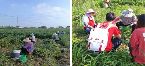 田間農民進行毛豆采摘工作 團隊成員與農民一同參與勞動