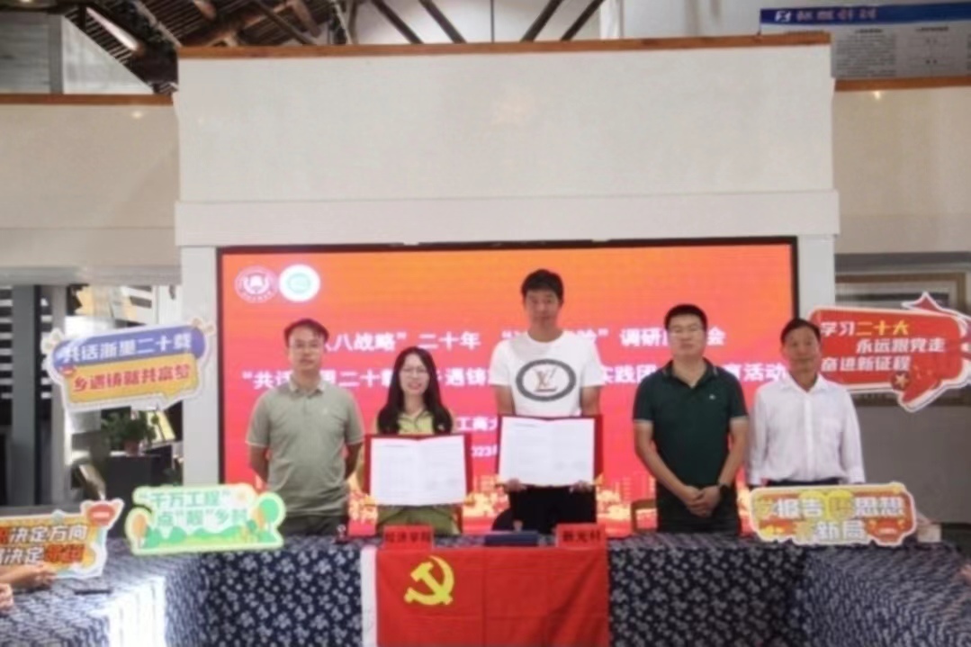 同時“八八戰略”二十周年“浦江經驗”調研座談會在新光村村禮堂成功舉行,經濟學院副院長王海,經濟學院團委書記莫瀟杭,浦江虞宅鄉黨委副書記胡建軍,新光村村支書記朱紅昌和新光村老村長朱玉堂出席了座談會。在會上,王海與莫瀟杭為新光村培育新時代大學生思政實踐教育基地和勞動實踐教育基地授牌,朱紅昌代表新光村接牌。接著,經濟學院與新光村共同簽署了共建大學生社會實踐基地協議書。會上,莫瀟杭對新光村表示感謝,并表達了雙方未來密切合作的期望,而朱玉堂則介紹了新光村的發展歷史,并對未來表達了真切展望。雙方將通過探索實施院村合作模式,推動形成重視和支持勞動實踐教育的濃厚社會氛圍,共同推進鄉村文化振興,實現共同富裕的美好愿景。