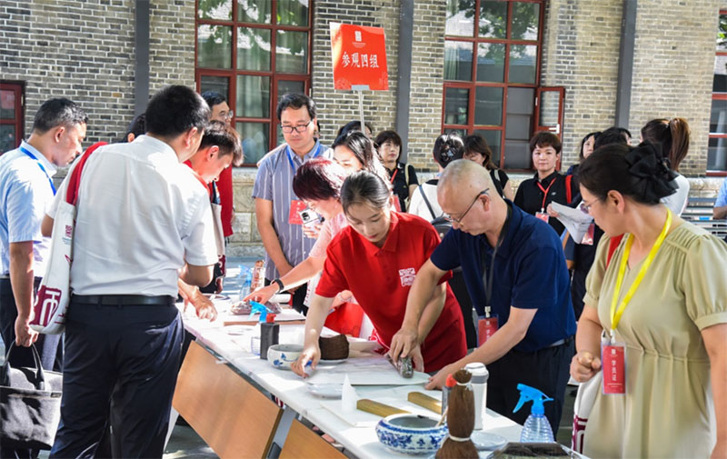 圖為實踐隊員幫助研修班老師進行木雕版拓印。 通訊員 于婷 供圖