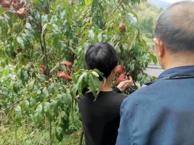 黃桃是當地一項重要經濟來源,所以村民們都十分愛護這些果樹。負責介紹的村民一邊示范一邊給我介紹:給黃桃套袋可以提高外觀品質,減少蟲害侵蝕。套袋一般要在完全謝花,坐果穩妥,等果實長到有乒乓球大小時進行,因為這個時候果實堅硬且沒有蟲害,是最佳的套袋時間。而現在果實成熟,正是采摘黃桃的時候。我照著村民教的方式采摘,勞作一上午確實很累。同時隨著一次次采摘,動作也越來越熟練。