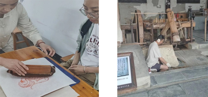 為了了解的更清楚,團隊來到了宣紙體驗間,從選撿、舂草、碓皮到紙簾制作到曬紙等各個小型展示間,深刻解了宣紙的具體制作并親自動手體驗了宣紙印章的復制。在觀賞期間,團隊了解到了宣紙文化園里所展示所用所造的宣紙全部屬于紅星宣紙集團,該集團也是世界上唯一一家純手工制作的巨型宣紙基地。且其生產的宣紙在干燥的環境下一千年不腐,可謂是堅韌無比。