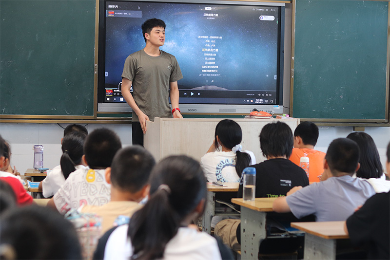 宣講結束后,接著便開展教學軍歌的活動,由小組成員做示范,帶領著學生們一起唱著這激昂壯闊的歌曲。稚嫩且堅定的歌聲充斥著整個校園,一時間全體成員仿佛是感受到了那拳拳的愛國之情,不由自主的加入其中。