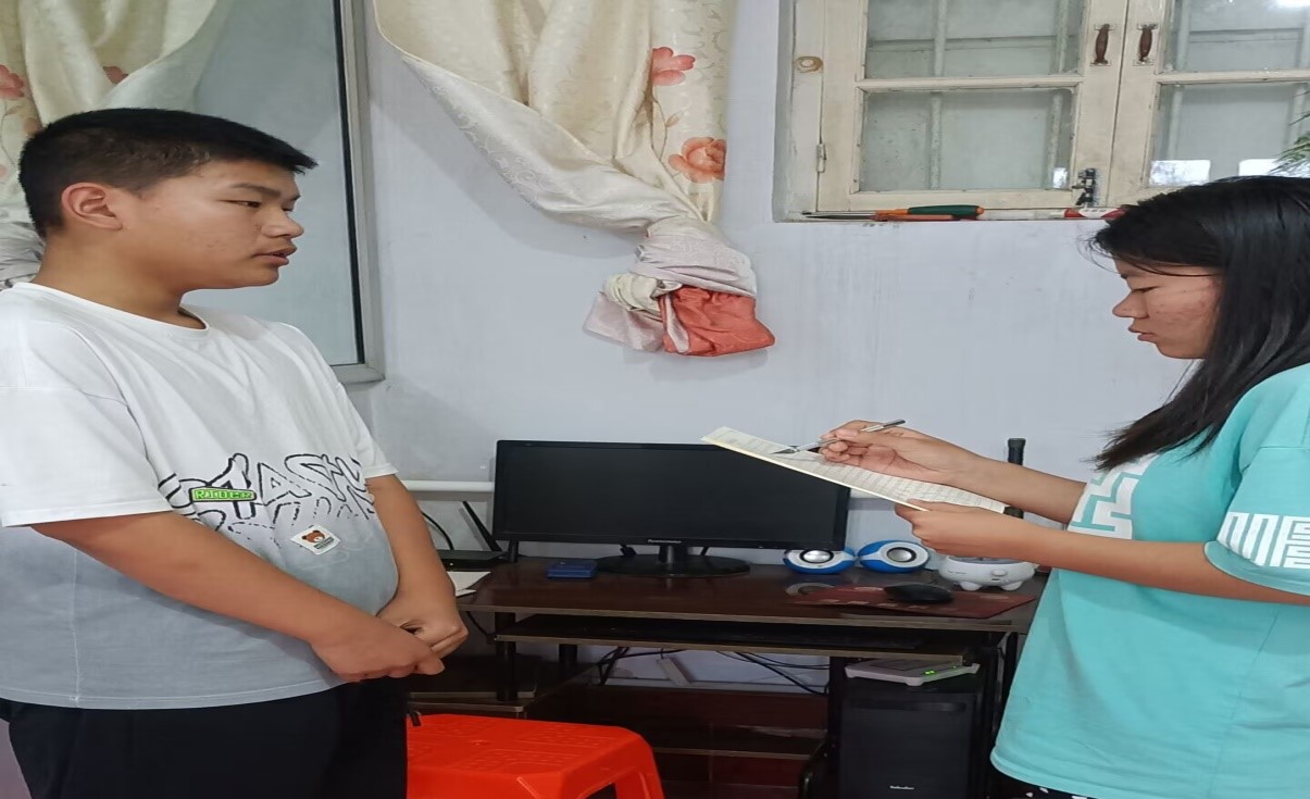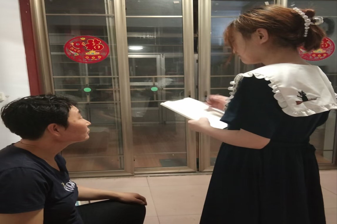 (圖為實踐隊成員對村民進行采訪。 萬佳璇 攝)